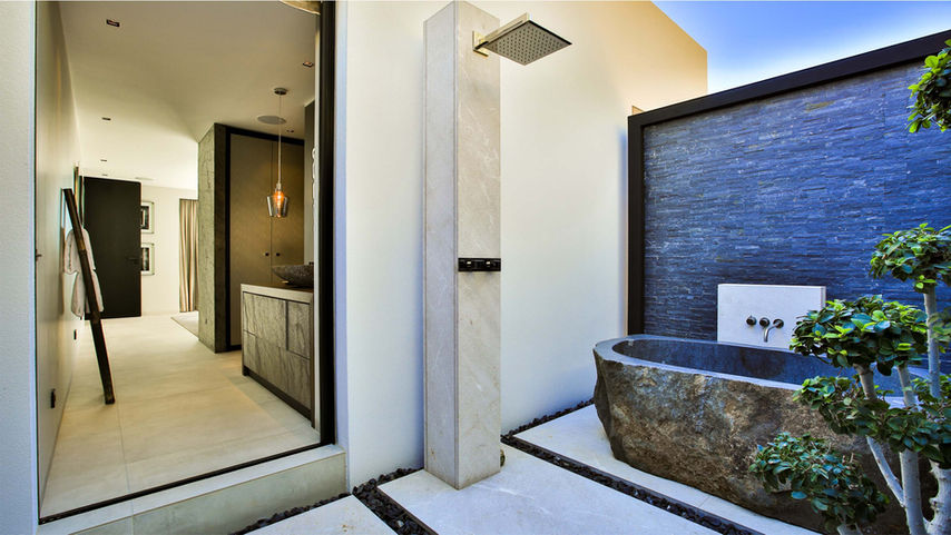 Each bedroom includes high-quality box-spring beds, air conditioning, underfloor heating, smart TVs, safes, and bathrooms stocked with Campos de Ibiza toiletries.
