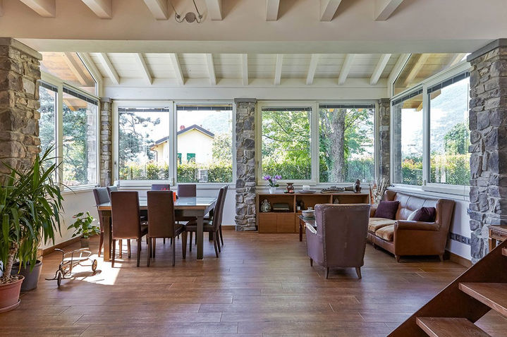The accommodations and living spaces are spread across three floors, accessible through an internal wooden staircase. With the charming stone cladding, whitewashed timber and leather furnishings, the modern design has a homey touch, and wrap-around windows throughout make the most of the stunning views. Head downstairs for the gym with its own shower room and the cantina stocked with the area’s most popular vintages. Two double bedrooms, each with their own shower room, are on the main floor, along with the well-equipped kitchen, an open plan living, and dining space, and a small library complete with books and games for those rare rainy days. Just outside the living room is the stone terrace with a dining and living area for fab al fresco feasts and a panoramic pool overlooking Lake Como for exercise and family fun. Upstairs you’ll find another double bedroom with a shower room and a small living room on the landing, which can also be used as a bedroom with its single sofabed and step out terrace.