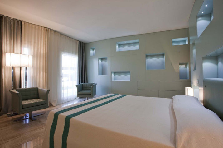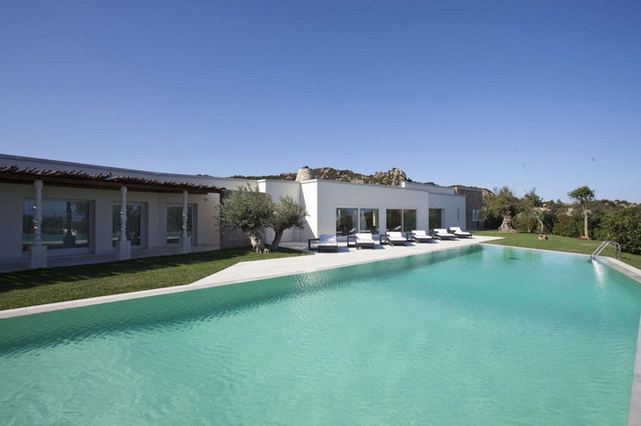 The estate is a modern villa of exceptional beauty featuring an impressive large entrance stairway, a hint of hard granite stone is the striking element of a pure white background property surrounded by a deep green garden. The front of the villa which faces the sea features large windows and a colonnade in Orosei stone that supports a long wooden canopy that shades the sleeping area that overlooks it, while on the opposite side, another canopy creates shade on the shower relaxation area and in the middle, a green lawn between a pair of beautiful olive trees, opens onto the large infinity pool.