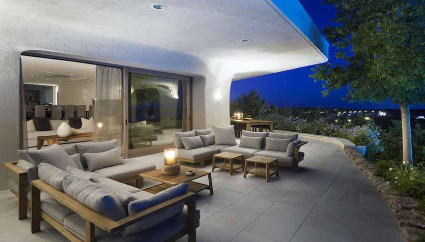 The elegant living room with kitchen opens onto verandas with space for outdoor dining and the majestic multi-level swimming pool, which can be accessed from all levels of the house. From the terraces and the swimming pool, you can enjoy the panoramic view of the sea.